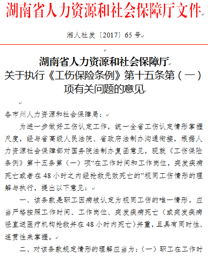 工傷保險(xiǎn)條例》第十五條第(一)項(xiàng)規(guī)定,“在工作時(shí)間和工作崗位,突發(fā)疾病死亡或者在48小時(shí)之內(nèi)經(jīng)搶救無(wú)效死亡的”視同工傷。為進(jìn)一步做好工傷認(rèn)定工作,統(tǒng)一全省工傷認(rèn)定情形掌握尺度,經(jīng)與省高級(jí)人民法院、省政府法制辦溝通銜接,根據(jù)人力資源社會(huì)保障部對(duì)國(guó)務(wù)院法制辦復(fù)函意見(jiàn),近日,湖南省人社廳就該條款視同工傷情形的理解與執(zhí)行提出相關(guān)意見(jiàn)。